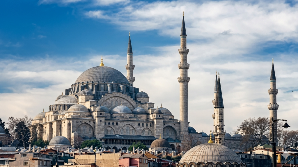 The Suleymaniye Mosque is a 16th-century imperial mosque in Istanbul. It was commissioned by Sultan Süleyman the Magnificent and designed by the celebrated Ottoman architect Mimar Sinan. It is one of Istanbul’s most prominent landmarks, symbolizing the classical period of Ottoman architecture and imperial power.